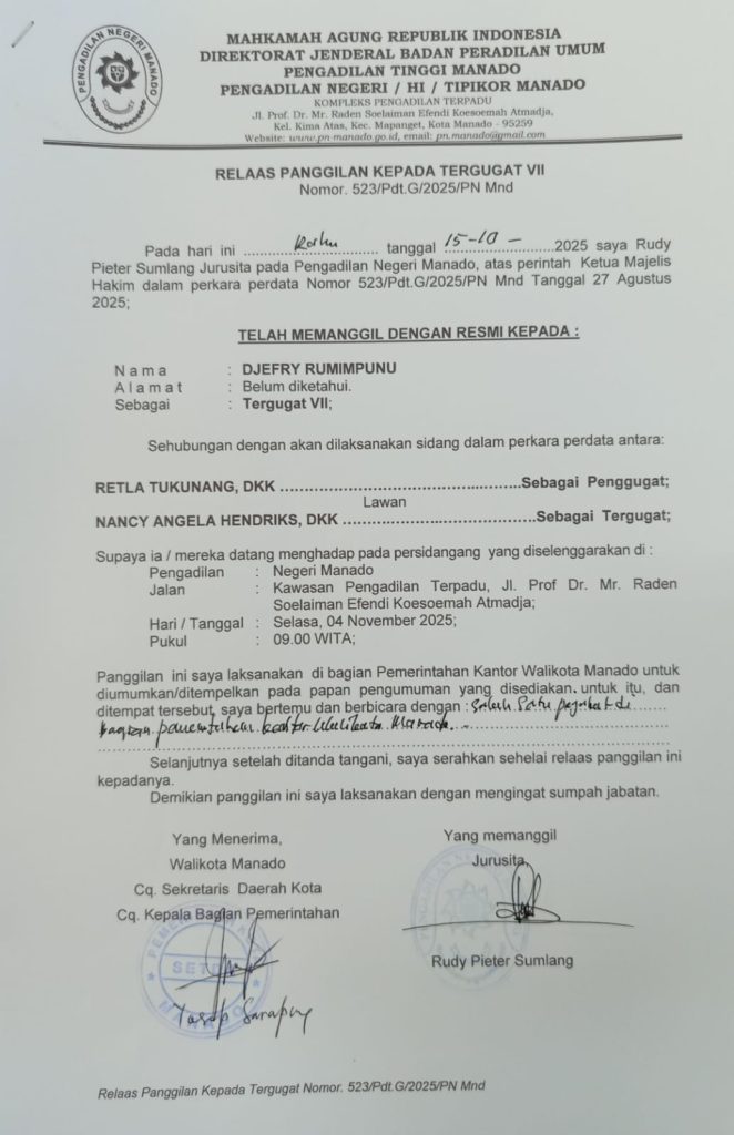 Relaas Panggilan Kepada Tergugat VII Nomor : 523/Pdt.G/2025/PN Mnd 15 Oktober 2025 CategoryTak Berkategori