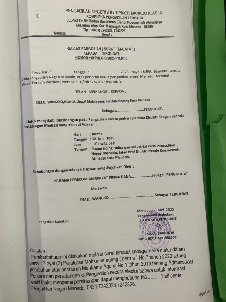 Relaas Panggilan (Surat Tercatat) Kepada Tergugat Nomor 10/Pdt.G/2025/PN Mnd 22 Mei 2025 CategoryTak Berkategori