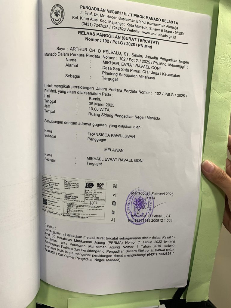 Relaas Panggilan (Surat Tercatat) Nomor: 102/Pdt.G/2025/PN Mnd 24 Februari 2025 CategoryTak Berkategori