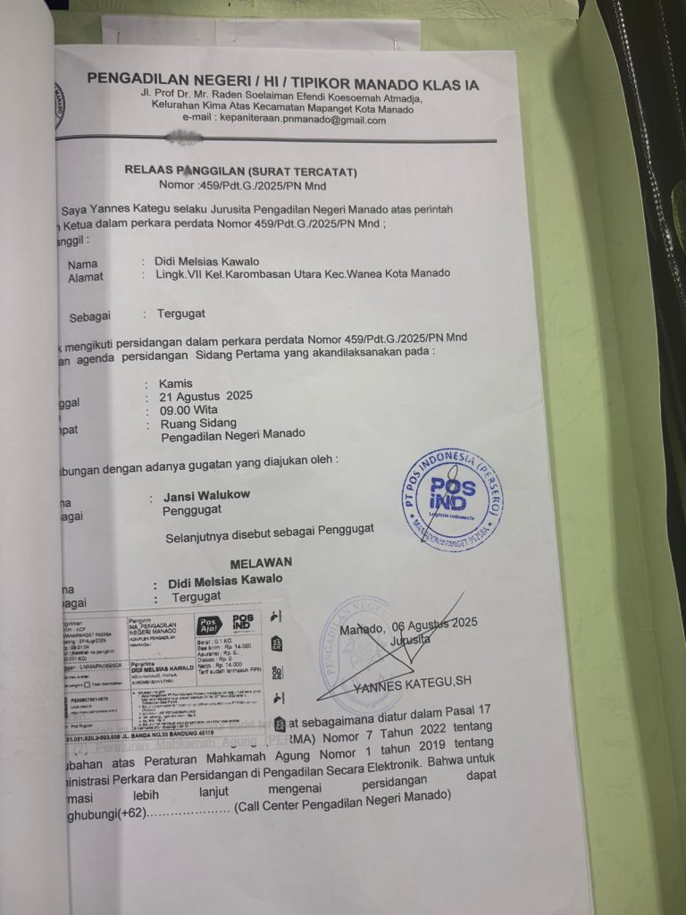 Relaas Panggilan (Surat Tercatat) Nomor 459/Pdt.G/2025/PN Mnd 6 Agustus 2025 CategoryTak Berkategori