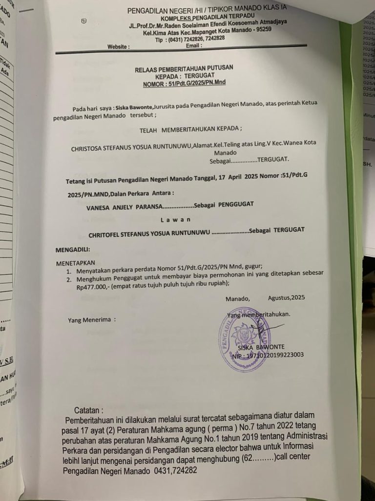 Relaas Pemberitahuan Putusan Kepada Tergugat Nomor 51/Pdt.G/2025/PN Mnd 17 Agustus 2025 CategoryTak Berkategori